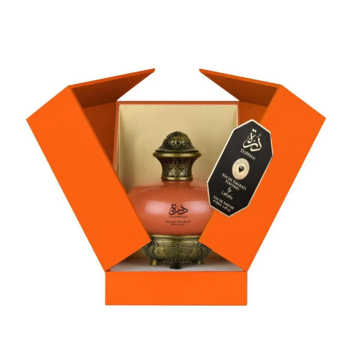 Durrah de Lattafa Perfumes é um perfume Floral Frutado Gourmet Compartilhável. As notas de topo são: Pêssego e Peônia. As notas de coração são: Osmanthus, Jasmim e Heliotrópio. As notas de fundo são: Almíscar e Patchouli.