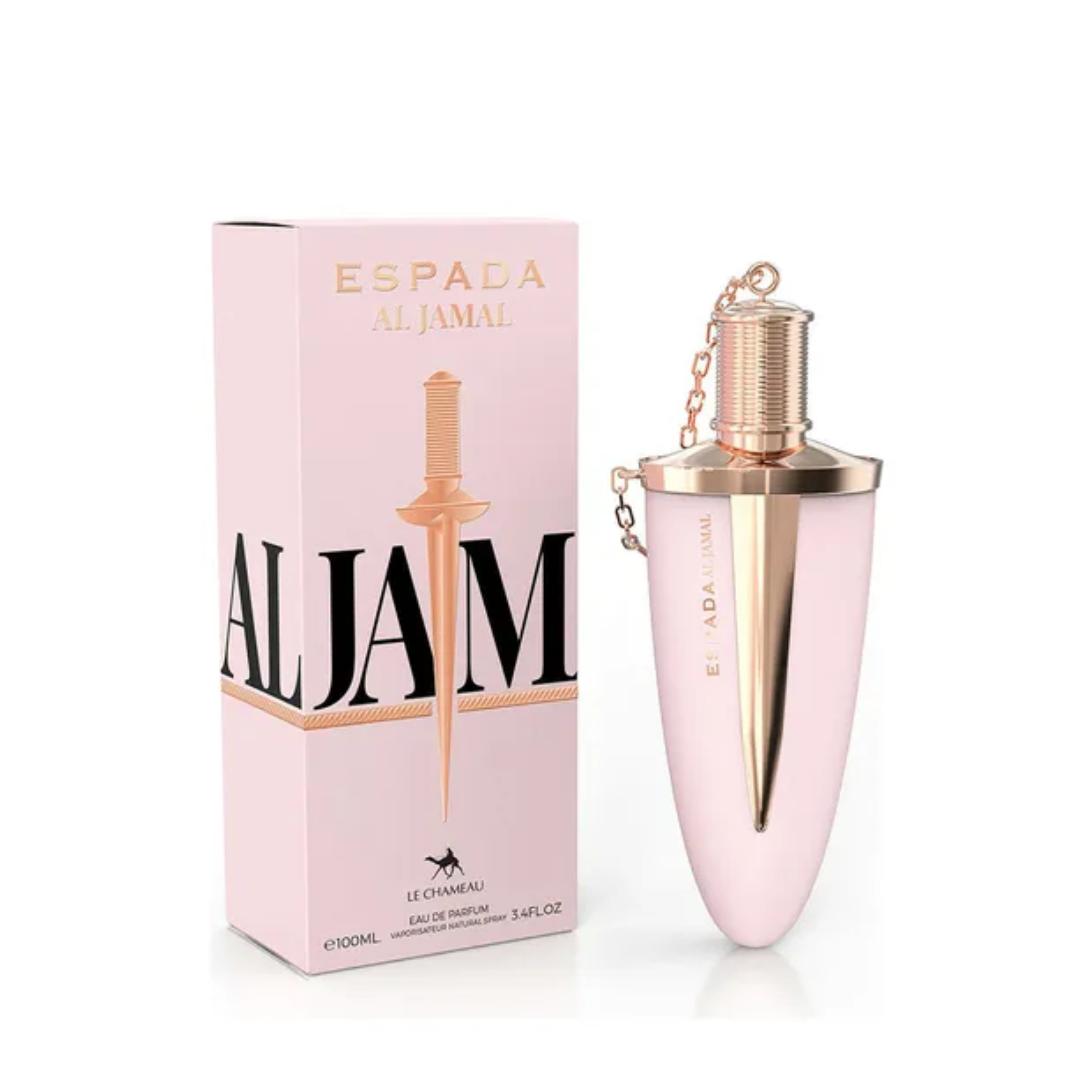 Espada Al Jamal de Le Chameau é um perfume Floral Amadeirado Almiscarado Feminino. Espada Al Jamal foi lançada em 2023. As notas de topo são: Pimenta Branca, Notas Verdes e Bergamota. As notas de coração são: Rosa, Jasmim e Violeta. As notas de fundo são: Almíscar, Cedro e Âmbar.