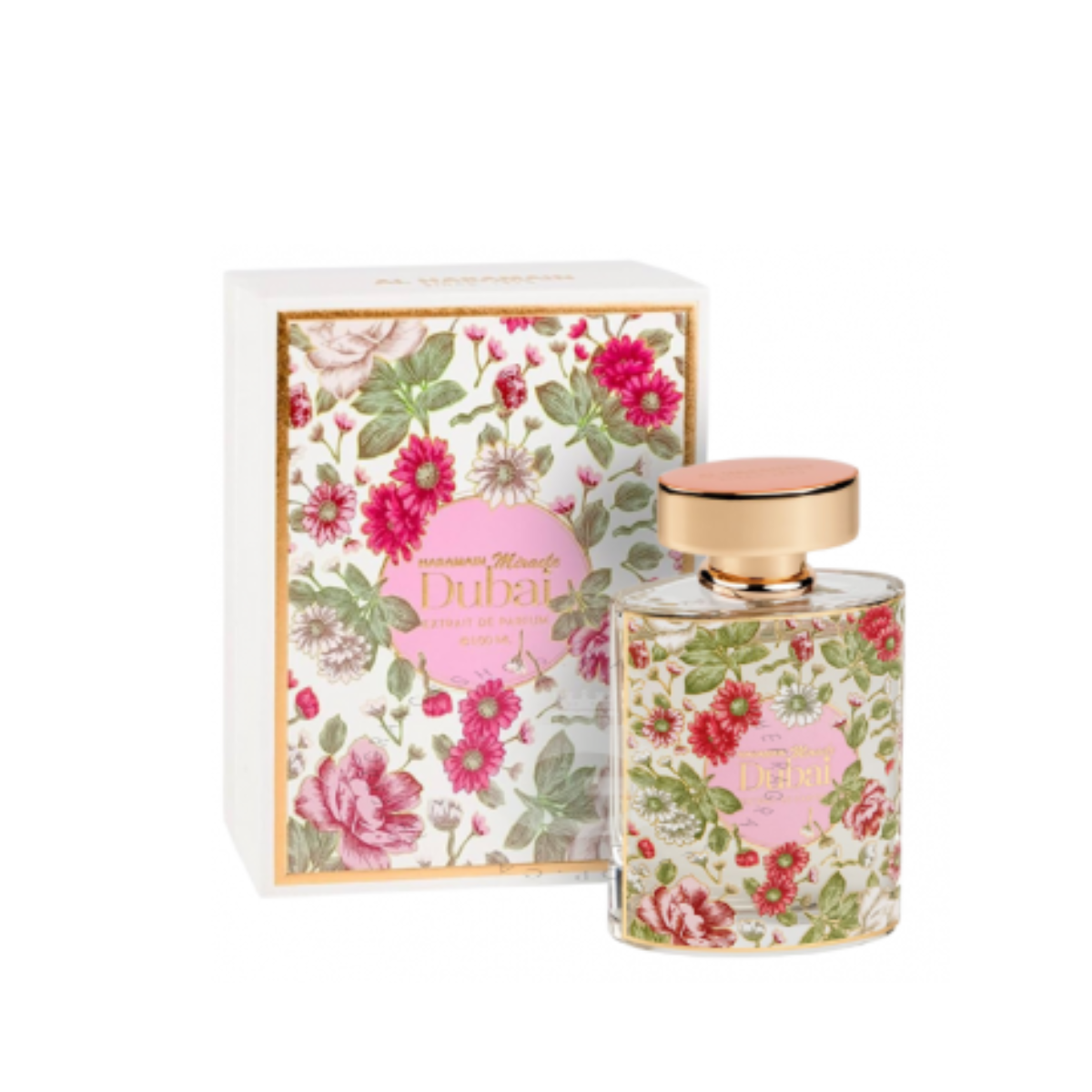Miracle Dubai de Al Haramain Perfumes é um perfume Floral Amadeirado Almiscarado Compartilhável. Esta é uma nova fragrância. Miracle Dubai foi lançada em 2024. As notas de topo são: Rosa Búlgara, Lichia, Notas Amadeiradas, Patchouli e Noz-moscada. As notas de coração são: Rosa, Flores Brancas, Sândalo e Baunilha. As notas de fundo são: Cedro, Almíscar, Notas Balsâmicas, Notas Atalcadas e Âmbar.