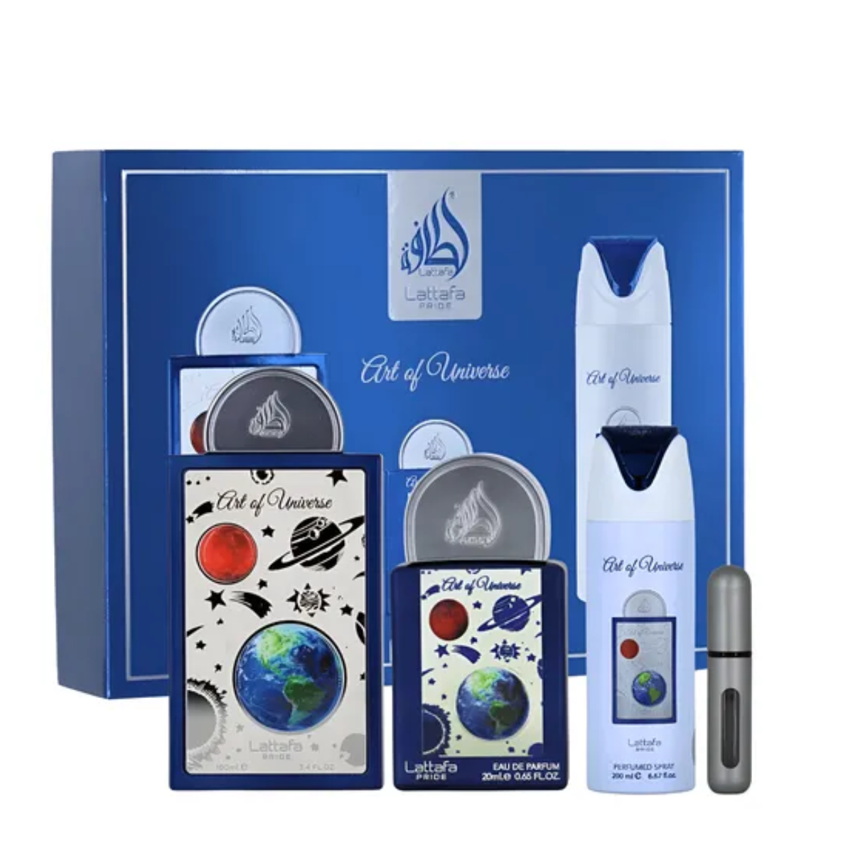 Art Of Universe de Lattafa Perfumes é um perfume Cítrico Aromático Compartilhável. Esta é uma nova fragrância. Art Of Universe foi lançada em 2025. As notas de topo são: Mandarina, Bergamota, Gengibre e Hortelã. As notas de coração são: Pera e Flor de Laranjeira. As notas de fundo são: Almíscar, Âmbar e Cedro