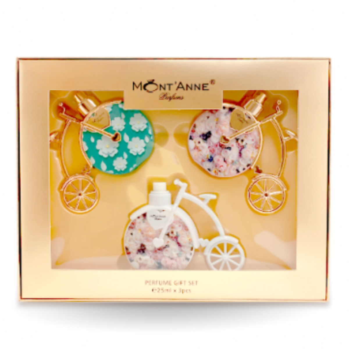 A delicadeza das pétalas de jasmim e flores de laranjeira encontra-se com a personalidade da lavanda e compõe as notas de coração da nova fragrância With Love Glamour Mont’Anne, na qual as flores claras preparam para o surgimento quase místico da baunilha, do âmbar e do cedro: este é o aroma que evoca uma aura cintilante e repleta de carisma e feminilidade para a mulher que equilibra poder e sensualidade, transformando os ambientes com a suavidade marcante de sua presença inesquecível. A luxuosa embalagem em formato de bicicleta retrô parisiense realça a personalidade do perfume, e integra a coleção de bicicletas Mont’Anne que já se consagraram entre os amantes da marca.